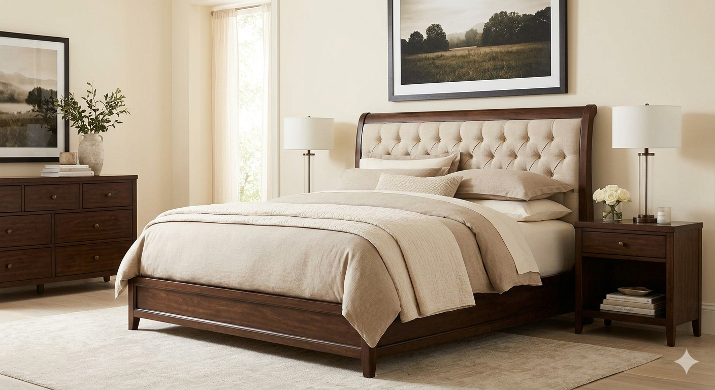 Description: A sophisticated modern American classic master bedroom featuring warm cream walls. The furniture is crafted from rich, dark stained wood, including a grand tufted upholstered bed with layered beige and cream bedding. Large framed landscape art hangs above the bed, which is softly lit to emphasize cozy neutral tones and sophisticated comfort.