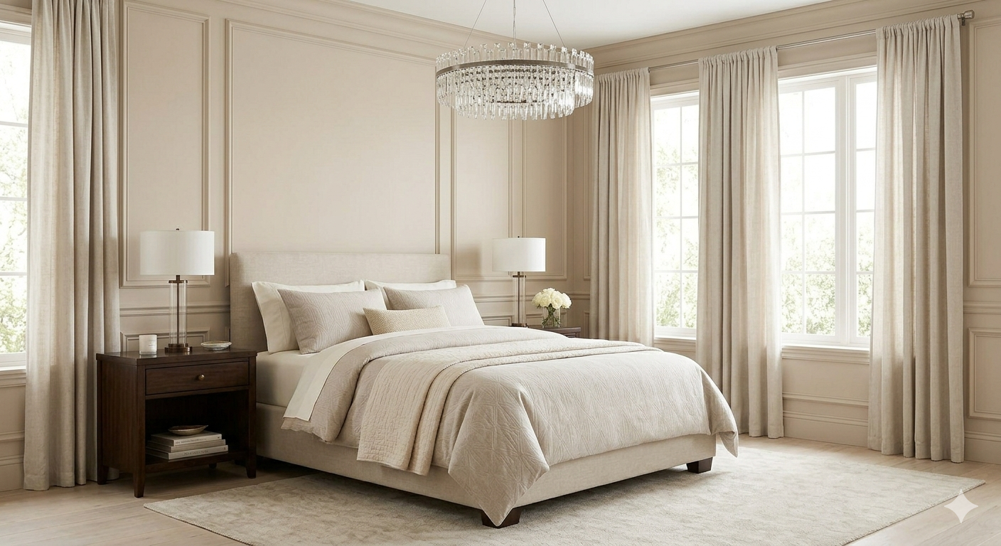 Description: A refined classic American bedroom with modern details, featuring elegant paneled walls painted in a soft beige. The decor includes light linen curtains covering large windows and an elegant, contemporary crystal chandelier. Dark, polished wood nightstands sit beside a bed with subtle modern geometry.