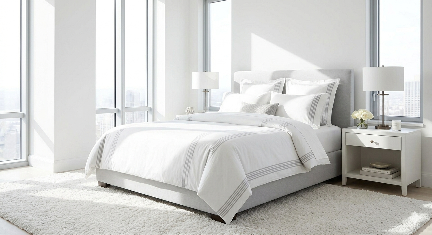 Description: An exceptionally bright and airy modern classic bedroom, rendered with high-key lighting, dominated by white and soft gray tones. A deep, plush white carpet covers the floor, and sunlight streams dramatically through large, floor-to-ceiling windows. The bed features crisp white bedding with subtle gray stripes, emphasizing simple symmetry and fresh, upscale American style.
