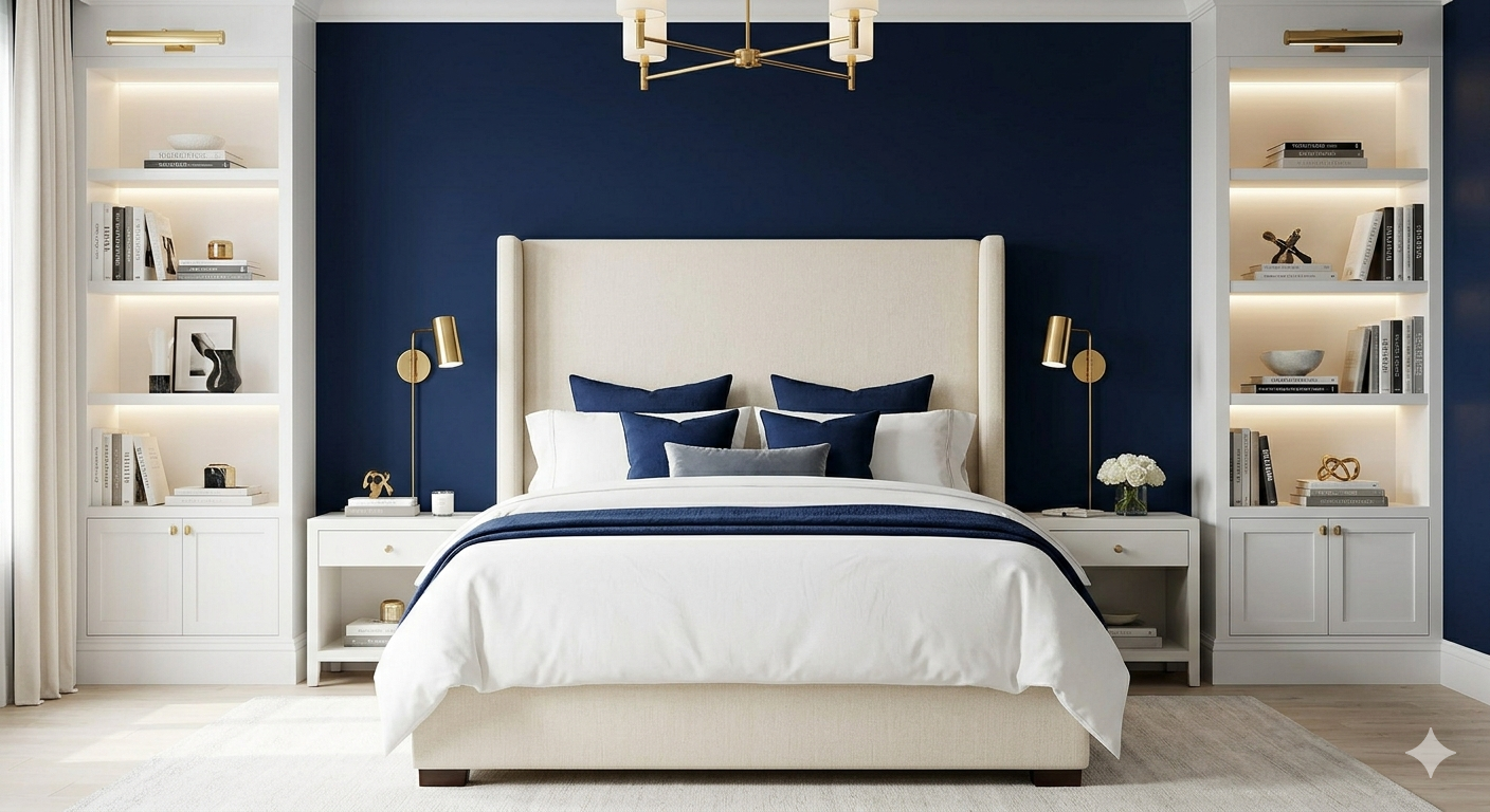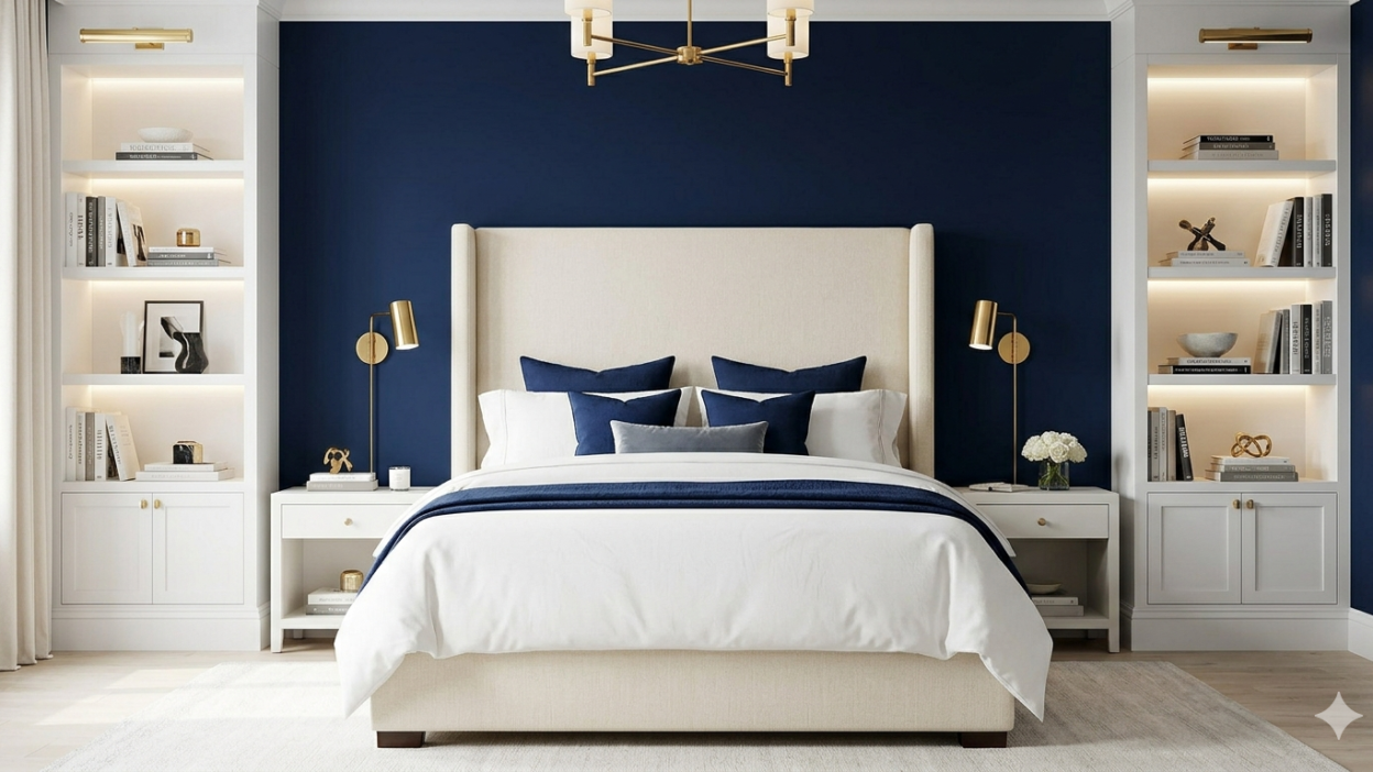 Description: A luxurious modern American classic bedroom that blends a bold palette with integrated architectural lighting. The room features a dramatic navy blue accent wall behind a very tall, upholstered cream-colored bed. Polished gold accents are used sparingly on light fixtures and hardware. Custom built-in white shelving units flank the bed, softly illuminated by integrated LED lighting, highlighting books and stylized decor.