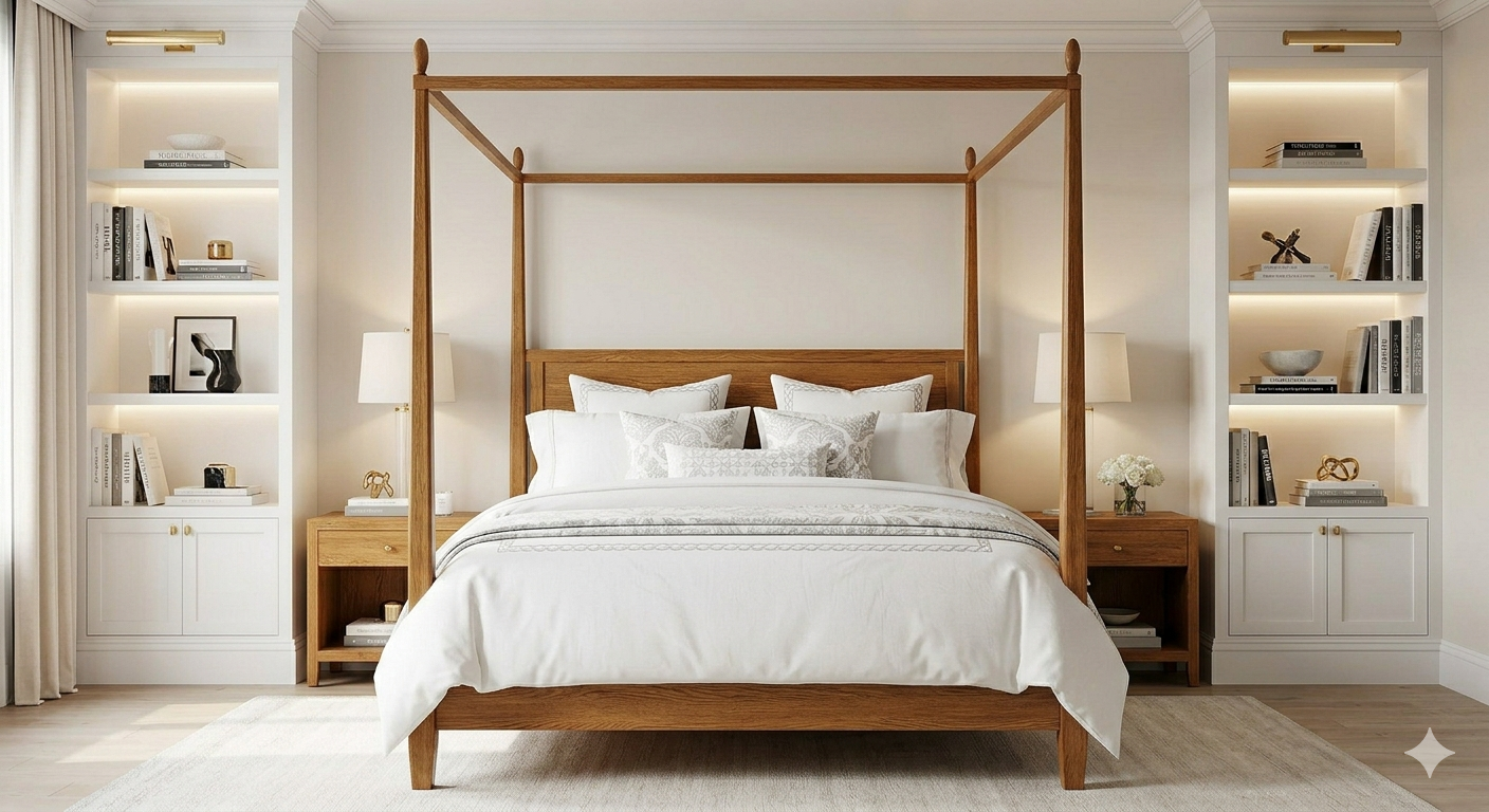 Description: A traditional American bedroom update focusing on warmth and refined molding, maintaining high visual fidelity. The room features polished oak wood furniture, including a four-poster bed frame. The bedding is crisp white linen accented with subtle, sophisticated patterns in light gray. Elegant crown molding traces the ceiling, and the room is softly illuminated by warm, integrated ambient lighting.