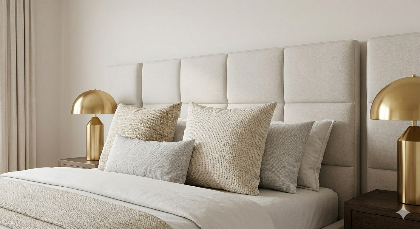 Description: A modern classic bedroom interior focusing on tactile textures and a simple, premium aesthetic. This scene features a clean-lined upholstered bed with a segmented, paneled headboard. Polished brass fixtures are used for bedside lamps, and the visual focus is on the array of textured pillows in cream, beige, and light gray.