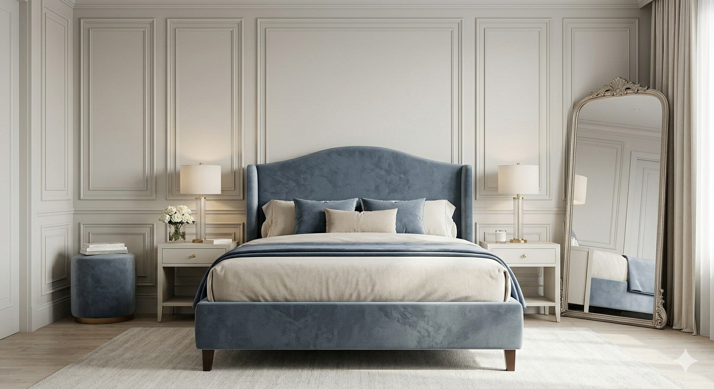 Description: A chic and comfortable upscale modern American bedroom featuring a plush velvet bed with a curved headboard in a muted steel blue tone. The walls have elegant decorative molding, rendered with crisp detail. The overall color palette is a sophisticated blend of muted blue, cream, and soft gold accents. A large, ornate floor mirror catches the soft ambient light.
