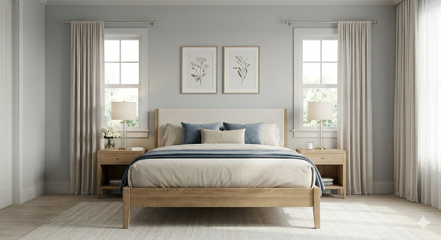 Description: A calm and welcoming classic American guest bedroom, focusing on a modern minimal look with clean lines and simple symmetry. The walls are a peaceful light gray, contrasting with natural oak wooden nightstands and a clean-lined bed frame. Simple, minimalist framed botanical artwork hangs above the bed, dressed with soft, flowing curtains.