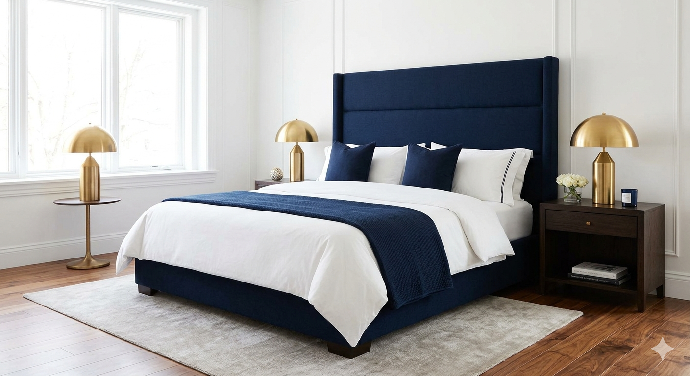 Description: An elegant modern American classic bedroom centered around a king-sized bed with a deep navy blue upholstered headboard. The color palette is strictly white and navy, highlighted by polished brass lamps on dark wood nightstands. The flooring is warm hardwood with a soft area rug, and natural light streams from a large window.