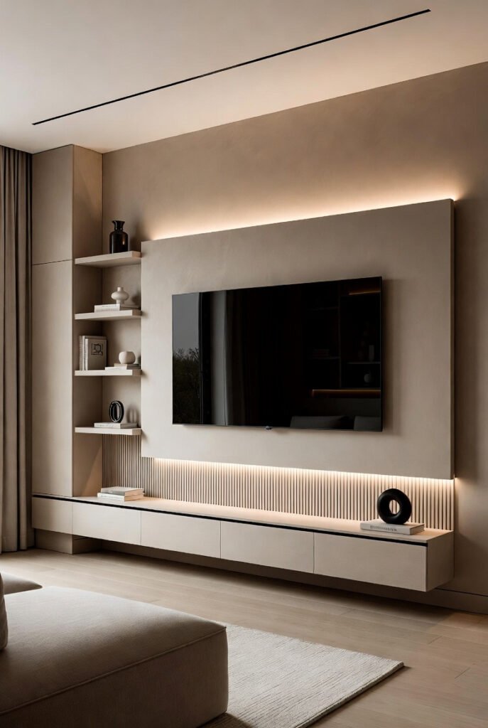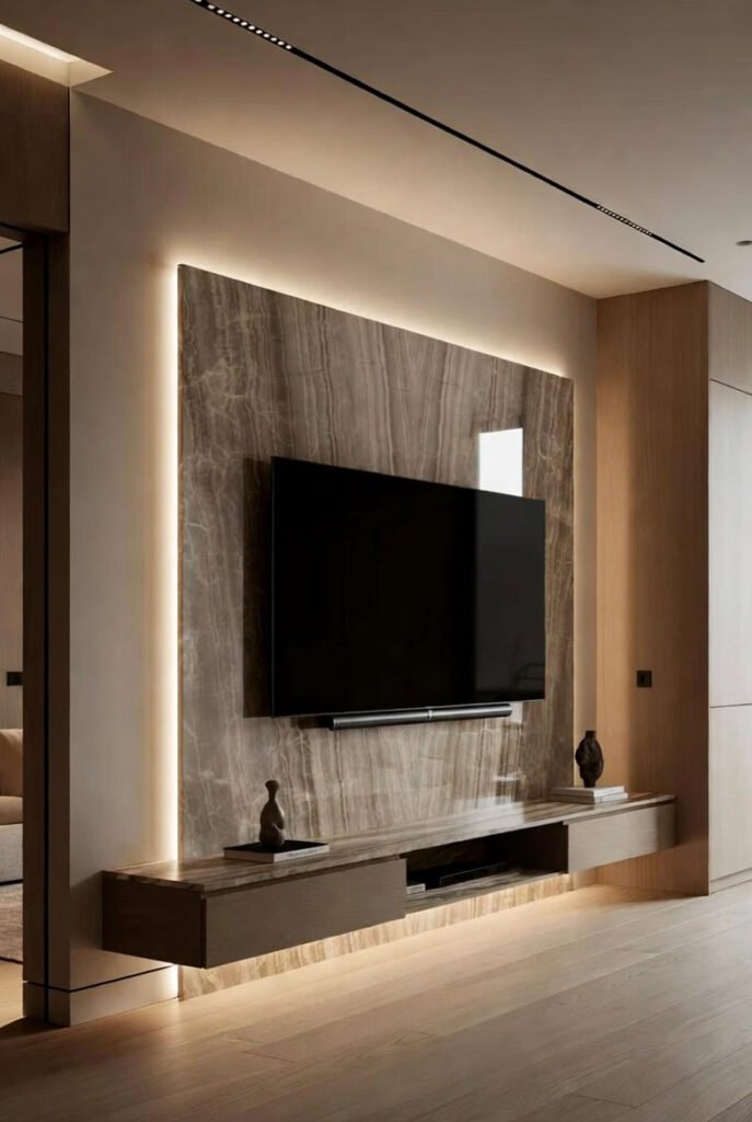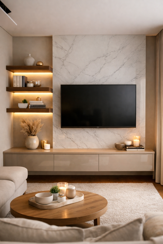 Go for a floating shelves TV wall setup. Wall-mounted shelves create clean lines and display space without eating floor area. Add luxury with slim marble panels or warm wood textures behind the TV. Install warm LED strip lighting behind shelves or around the mount for a soft, upscale glow that highlights textures beautifully.
