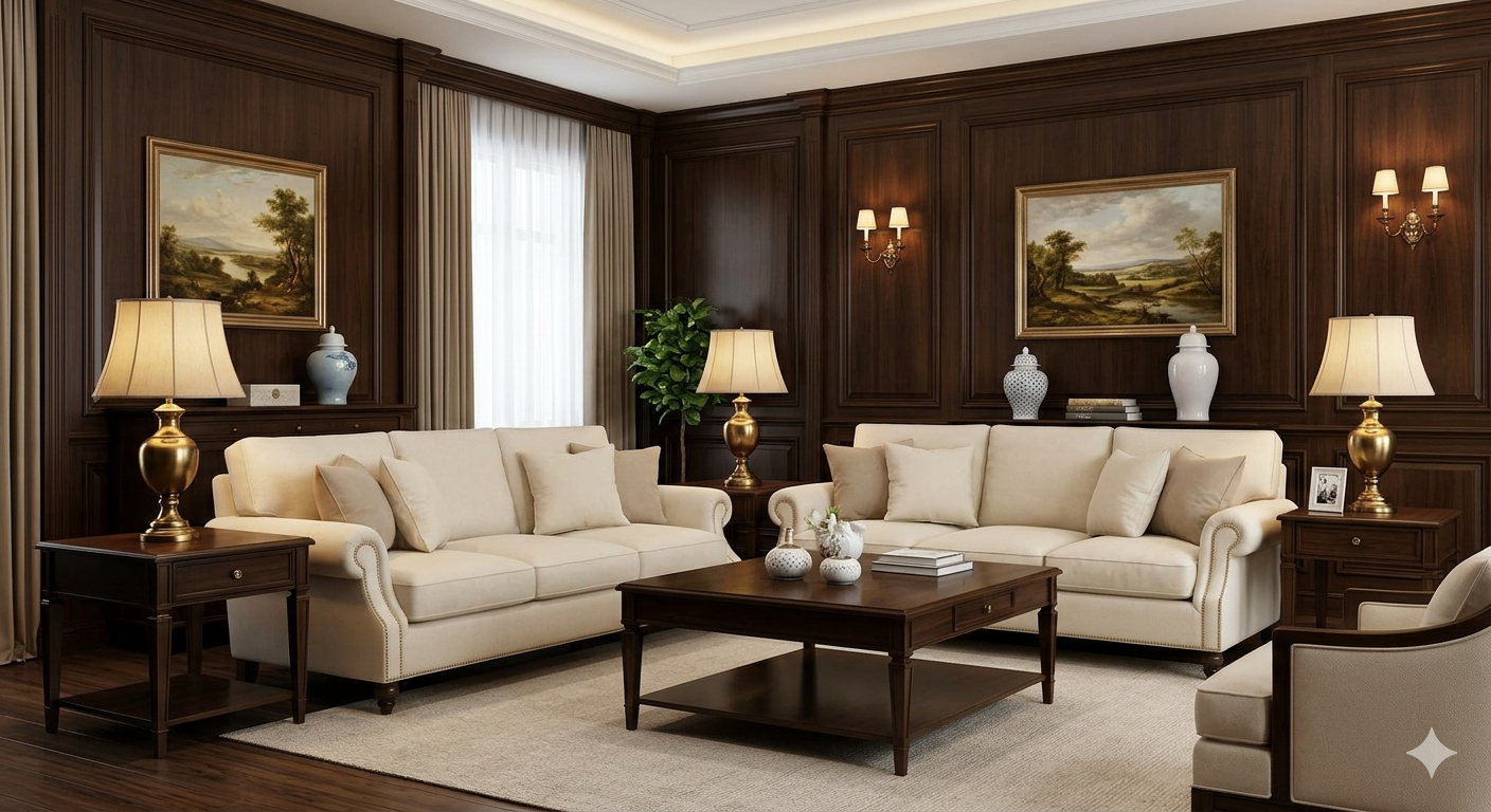 Description: Rich walnut furniture anchors this sophisticated living room. Paired with cream upholstery and brass lighting, the design balances masculine warmth with upscale elegance.