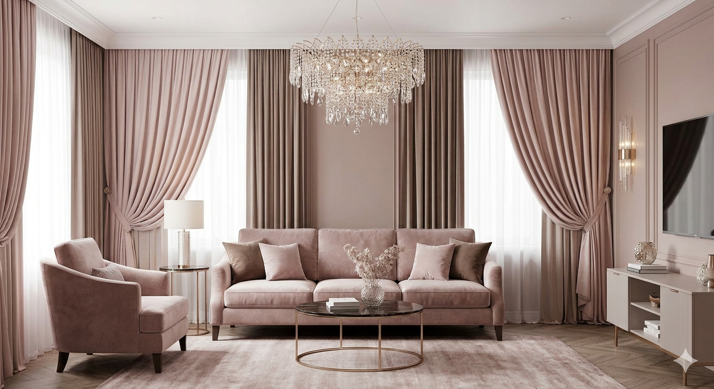 Description: This space merges transitional balance with modern glamour. Blush and taupe tones dominate, accented by luxurious velvet textures and a dazzling statement chandelier that centers the room.
