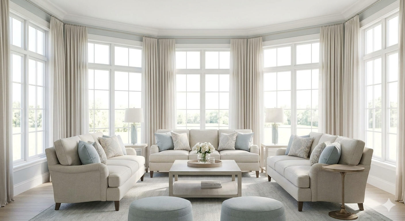 Description: Defined by large windows and flowing, airy fabrics, this living area maximizes natural light. The neutral color palette creates a bright, welcoming, and expansive luxury environment.