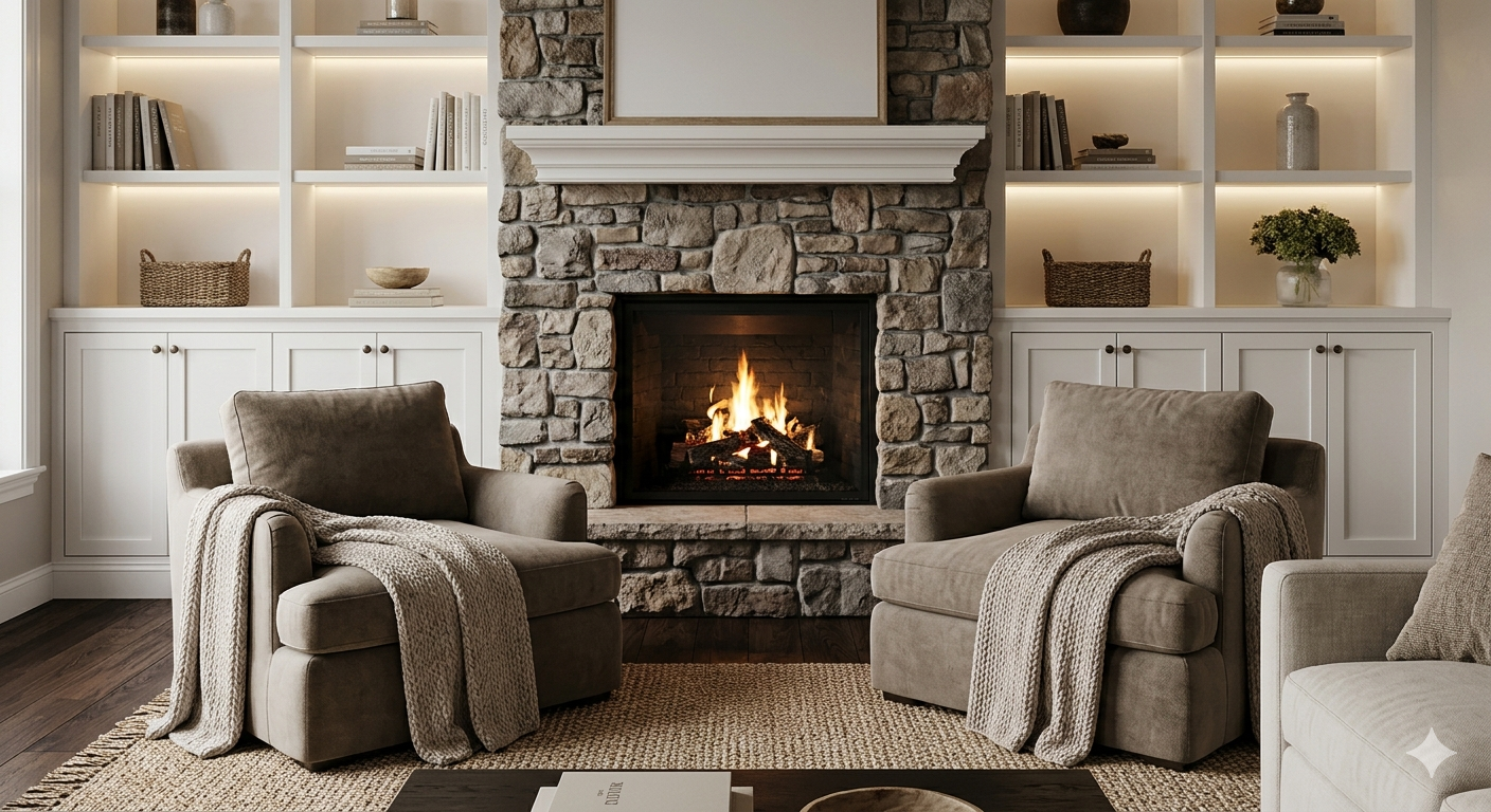 Description: This transitional living room centers on a grand fireplace flanked by custom built-in shelves. Layered textures, soft architectural lighting, and comfortable seating make this the ultimate warm gathering space.