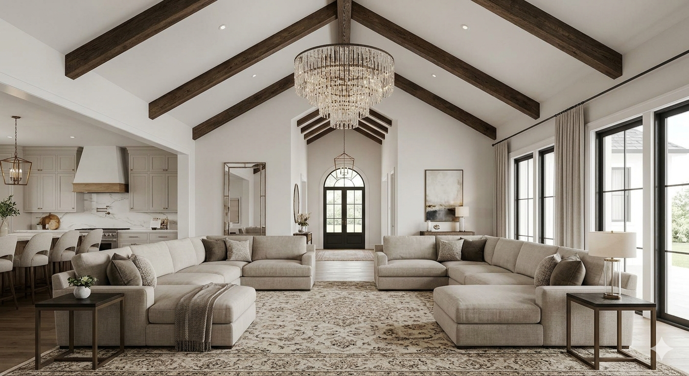 Description: To emphasize the dramatic vertical space of vaulted ceilings, this room uses oversized furniture and grand lighting. A massive transitional chandelier draws the eye upward, creating a majestic and luxurious feel.