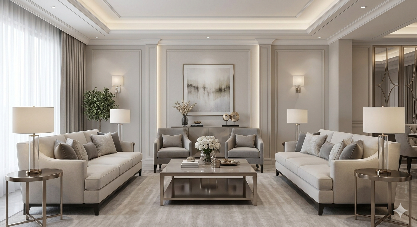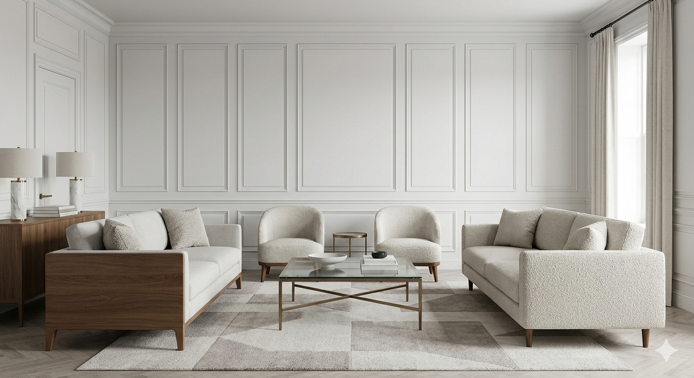 Description: This design harmonizes clean, contemporary furniture lines with traditional architectural details like classic wall paneling. Neutral upholstery and soft textures maintain a balanced, modern-classic aesthetic with elegant symmetry.