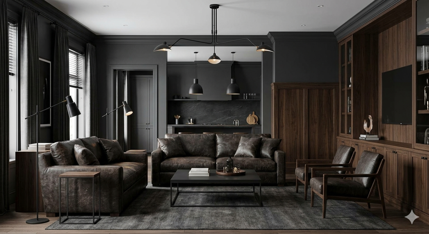 Description: Charcoal tones, rich leather seating, and dark wood elements define this bold lounge. The moody palette is balanced by modern lighting fixtures, creating a refined and strong transitional space.
