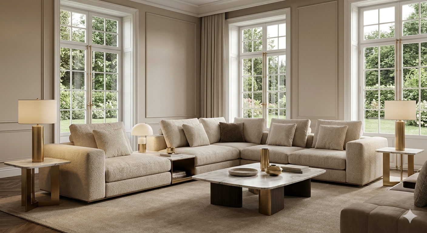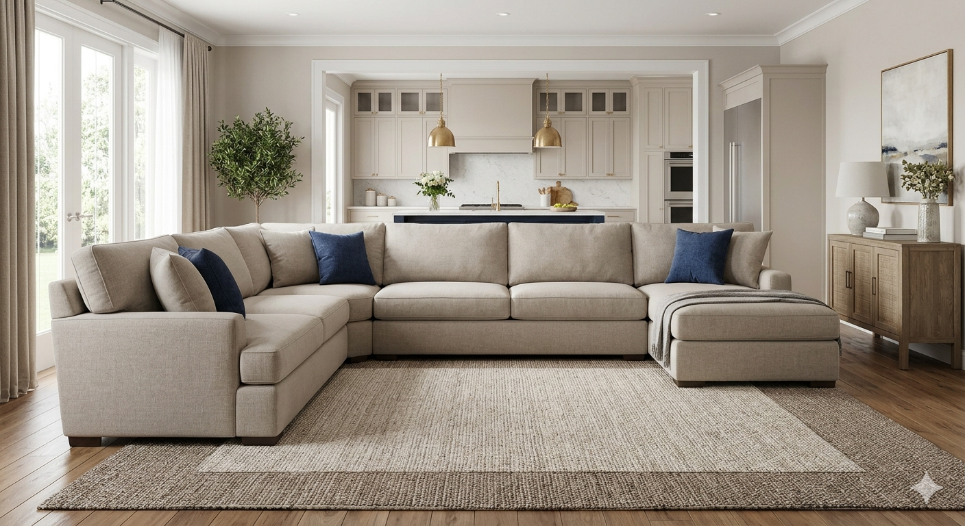 Description: This American family living room is designed for both style and high-traffic comfort. A massive sectional sofa dominates the room, anchored by layered rugs and soft, warm neutrals, proving luxury can be cozy and practical.