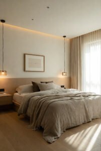 Install floating nightstands to free floor space and create clean lines. Swap table lamps for wall sconces or soft LED strips to keep surfaces clear while adding warm, soft lighting. Choose a low bed frame or one with hidden storage for a streamlined modern bedroom interior.