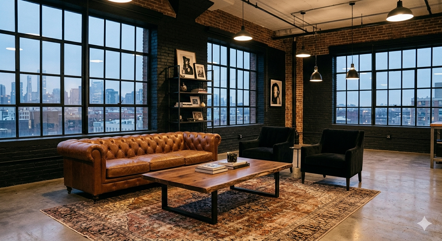 Common in converted lofts in cities like New York or Chicago, this style celebrates raw architecture while introducing high-end comforts. It is defined by the contrast of rugged surfaces and refined furnishings.