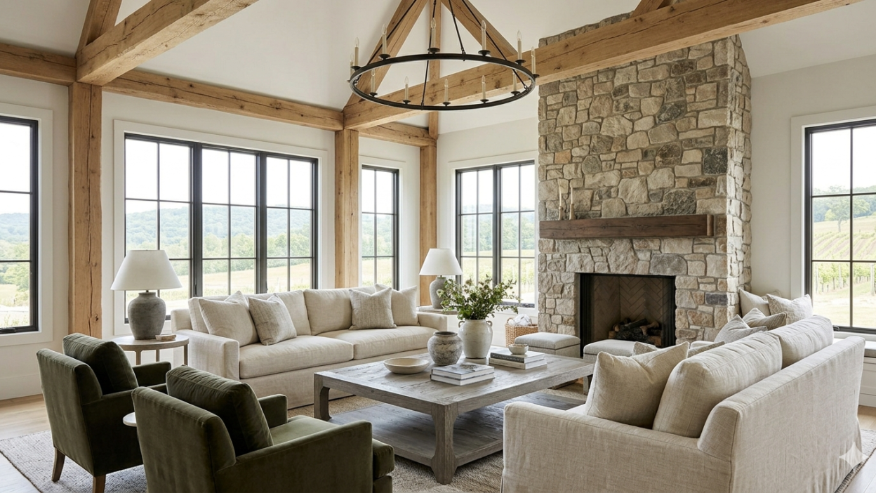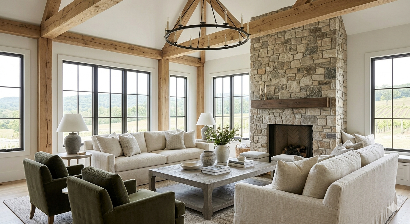 Description: Defined by its warmth, this living room features a floor-to-ceiling fieldstone fireplace and exposed natural oak beams. The furniture is a mix of comfort and structure: cream linen slipcovered sofas provide a relaxed feel, while dark olive velvet armchairs add a refined color accent. Natural light floods the space, highlighting the distressed wood and stone textures.