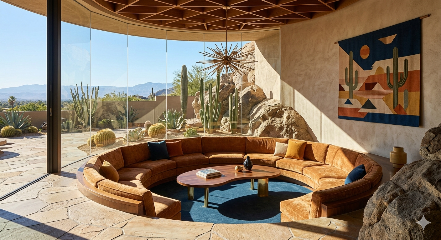 Description: This desert retreat centers on a sunken “conversation pit” with a curved sectional in earth-toned orange velvet. A kidney-shaped walnut coffee table and a sculptural Sputnik chandelier define the space’s geometric mid-century roots. The living area is built directly into a natural rock formation, with floor-to-ceiling glass walls providing seamless views of a curated cacti garden and mountain silhouette.