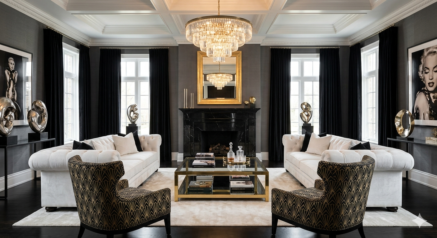 Description: This high-glamour design uses symmetry and high-contrast logic. A polished black marble fireplace is flanked by tufted white velvet sofas. The room features dark, polished ebony floors, charcoal silk wallcoverings, and heavy black velvet curtains. The opulence is maximized by reflective surfaces, gold-leaf accents, and a massive, multi-tiered crystal chandelier that defines the grand perspective.