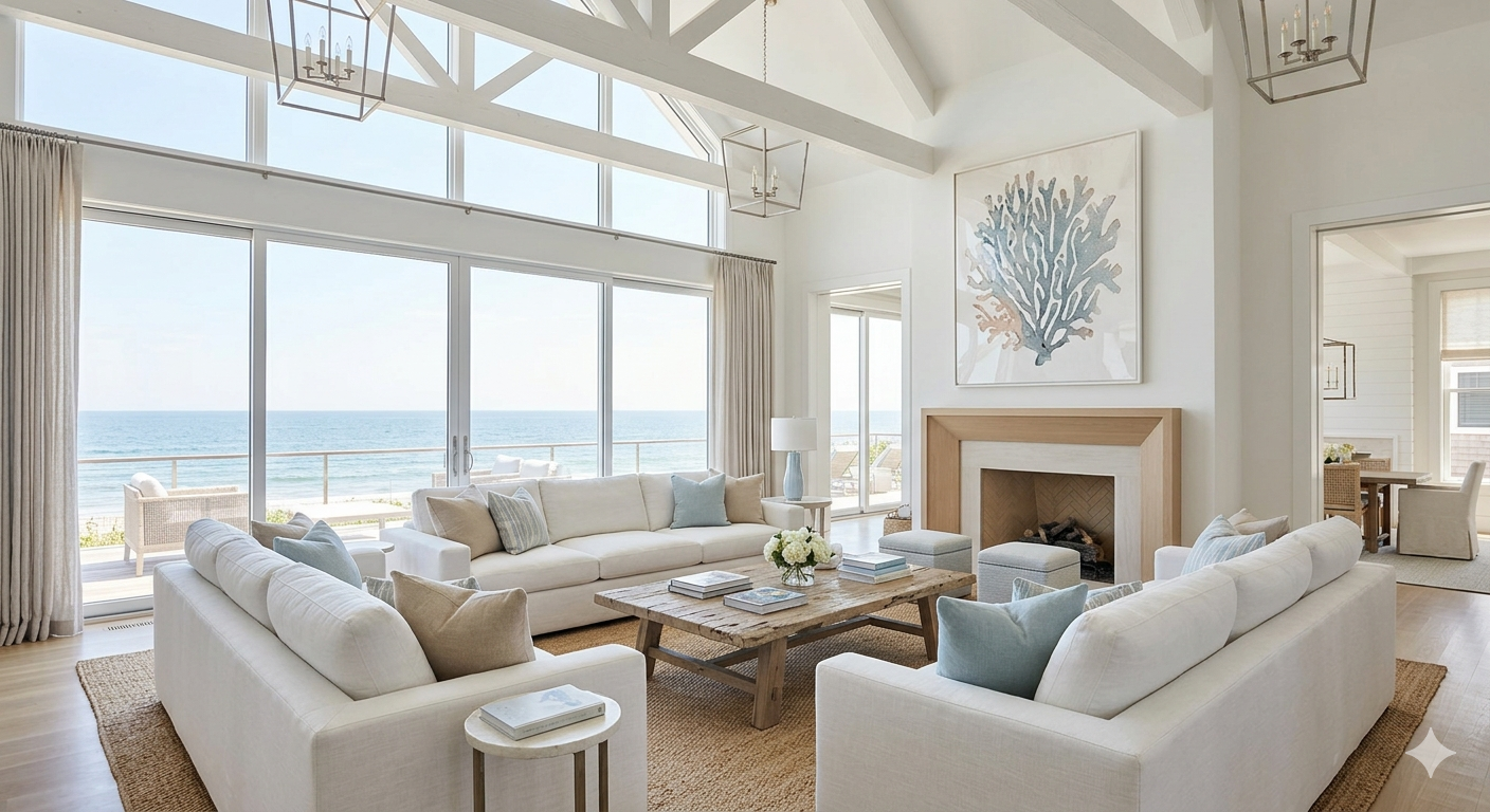 Description: This design centers on an airy, open-plan space. It features double-height ceilings with exposed beams and massive windows that frame ocean views. The aesthetic uses light-reflective surfaces, natural textures (like jute and driftwood), and a crisp palette of soft whites and sea-glass blues to create a relaxed yet sophisticated atmosphere.
